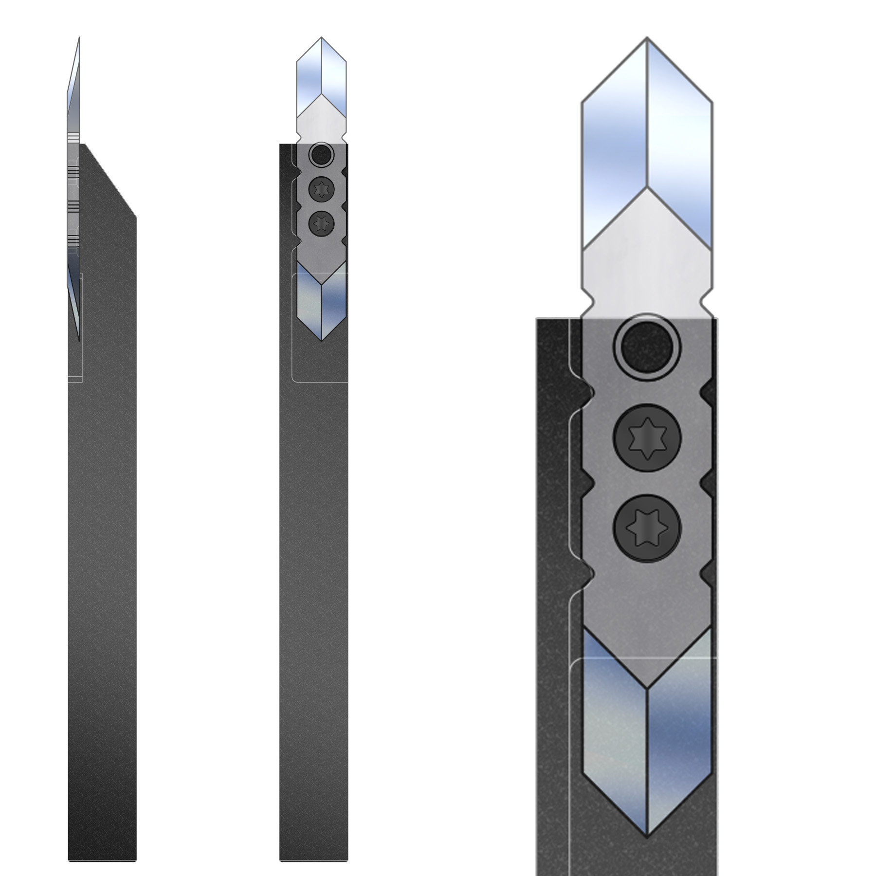 For both processing methods, our holder systems KBS 2-7 and KBS 2-9 are well suited. KBS 2-7 is designed for finer turning machines (from 8-shank) and thus smaller cutting depths up to 10 mm. The Dieterle holder system KBS 2-9, on the other hand, is intended for larger cutting depth up to 18 mm and more robust turning machines. Cutting depths (tmax) up to 25 mm are realized with our system KBS-2-9-L25. In addition, we have realized cutting depths up to >45 mm with custom solutions.
