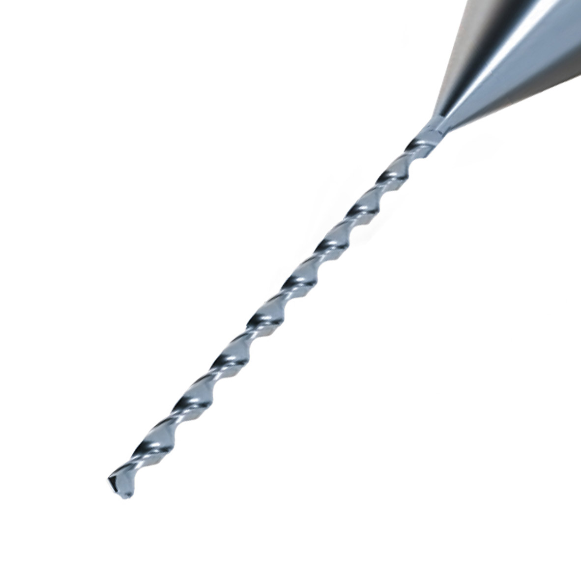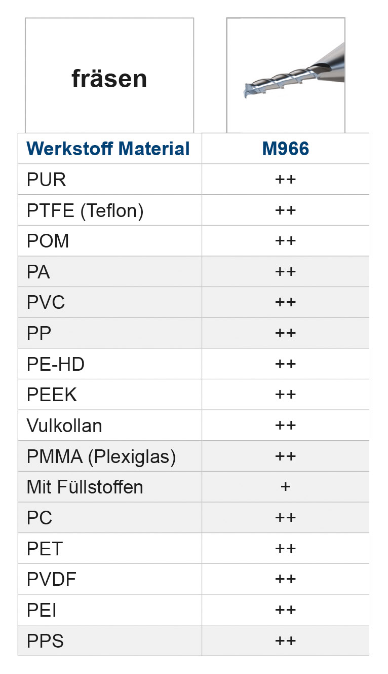 Zur Innenbearbeitung von Kunststoffen mit zwei Schneiden empfehlen wir den M966 als Standardwerkzeug. Bei uns ist dieser in den Abmessungen Ø d = 0,1 / l = 0,2 mm bis Ø d = 6 / l = 18 mm erhältlich. Für größere Durchmesser empfehlen wir Vorbohren und anschließendes Fräsen des endgültigen Innendurchmessers, um kurze Späne und einen prozesssicheren Ablauf zu gewährleisten.