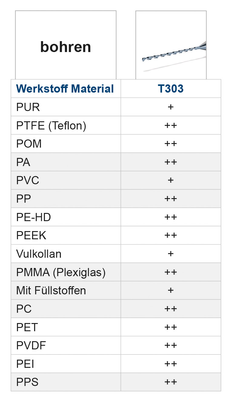 Der T303 ist die richtige Wahl zur Bohrungsbearbeitung bei Kunststoffen. Als vielseitiger Allrounder ist er als Standard bei uns in den Abmessungen Ø d = 0,3 / l = 5 mm bis Ø d = 3 / l = 26 mm verfügbar. Für größere Durchmesser empfehlen wir Vorbohren und anschließendes Fräsen des endgültigen Innendurchmessers, um kurze Späne und einen prozessicheren Ablauf zu gewährleisten.