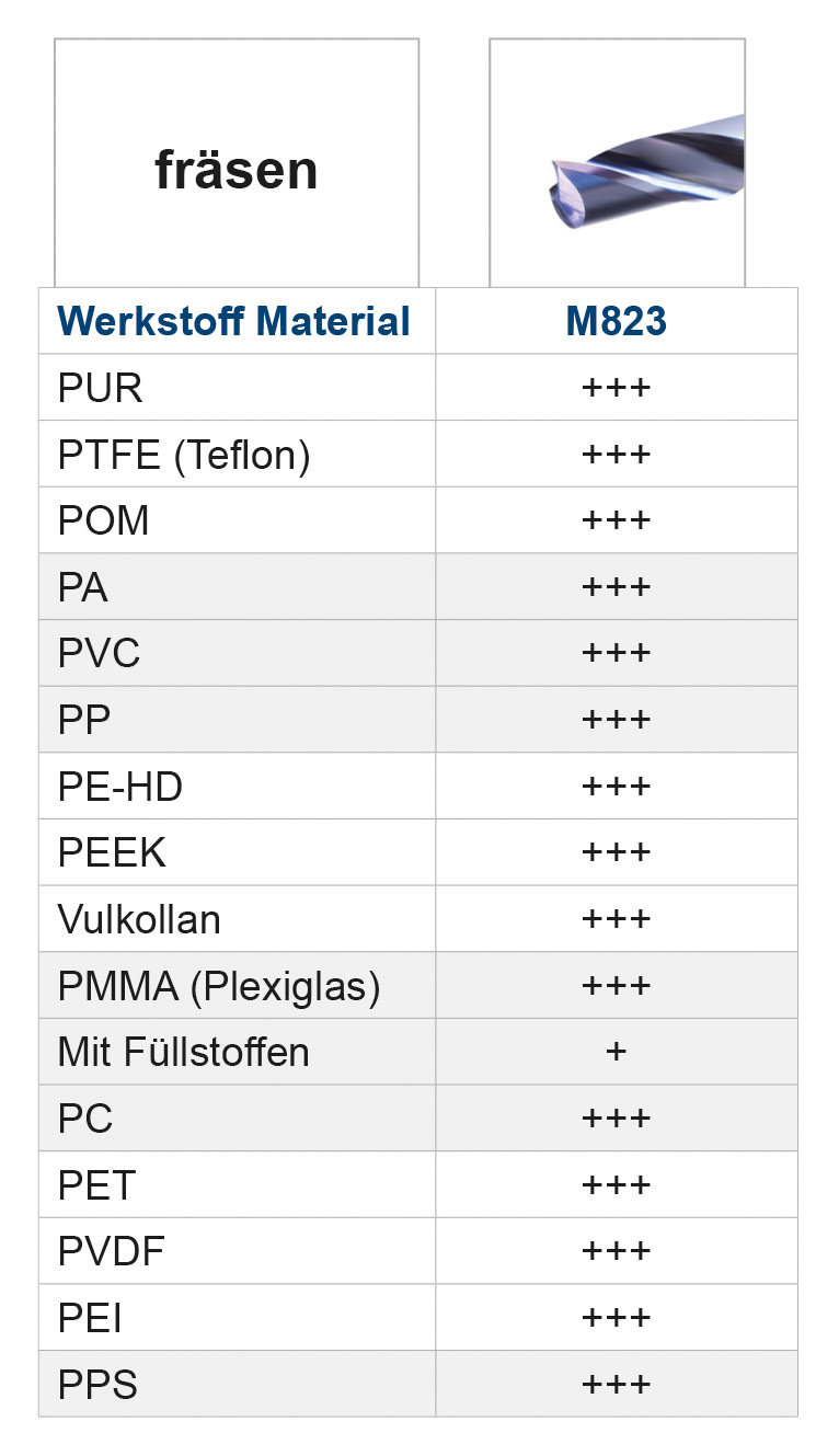 Der M823 eignet sich hervorragend für die Innenbearbeitung von Kunststoffen. Als Standardwerkzeug ist er bei uns in den Abmessungen Ø d = 1 / l = 5 mm bis Ø d = 12 / l = 22 mm erhältlich. Für exakte Bearbeitung des Durchmesser empfehlen wir Vorbohren und anschließendes Fräsen, um kurze Späne und einen prozesssicheren Ablauf zu gewährleisten.